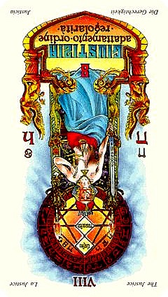 This card carries the number 11. In the Rider-Waite deck, Strength and Justice have swapped places because Waite saw links with the astrological signs Leo and Libra.
