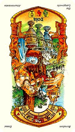 With the 4, the second cycle of this suit is commenced, where a choice between structure and feeling has to be made, where old securities have to be let go of to work towards a new future. But like Wands, Cups don't like structure much, they prefer to be free and dream rather than to make commitments and go for something.