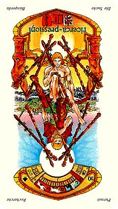 The 10 of Wands is therefore the transition from the element Fire (associated with Wands) to the element Water, associated with Cups. As you might imagine, this not the easiest of transitions.