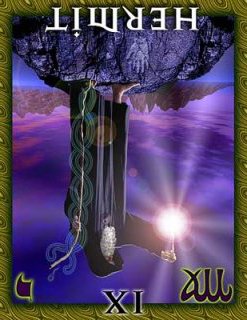 The Hermit shuts out the world and retreats into solitude to better understand some spiritual aspect of life. He opens to the cosmos and lets it's wisdom sink in. Hermits are often seen as wise old men who can guide a traveller along a journey.
