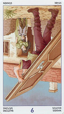 The 9 represents rest after work, which is another thing (like 8) that the element Fire associated with Wands is not very comfortable with. Fire likes to keep going. This rest will probably be spent thinking about what to do next along the course to completion.