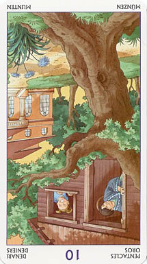 The 10 of Pentacles represents material posessions. The number 10 of Pentacles forms the links to the Ace (first card) of Wands (the first suit in the minor Arcana), and thus prepares to bring you back to the beginning of the minor Arcana, ready for a next cycle through the tarot.