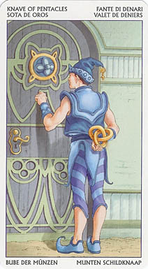 Pages explore and gather information about the road ahead, with an almost naive attitude. The Page of Pentacles is sometimes described as a bridge builder; Pentacles is the suit where the actual work is done, and the Page here enables those that follow to quickly cross difficult terrain.