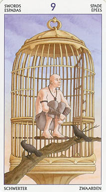 The 9 of Swords represents relief from cropped-up grief. The number 9 is a number of reward and rest and accomplishment. In the element of Swords there is not a lot of time for rest, but without any rest you'd just burn yourself out.