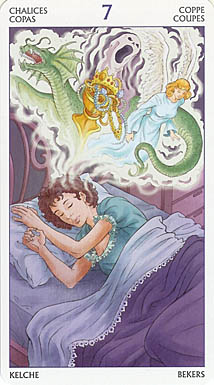 The 7 of Cups is about making a choice between different ideals. But Cups, with the water element, don't like making definitive choices that much, making this 7 in this suit a bit of a hard choice.
