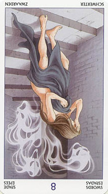 The 8 of Swords is about slowly regaining strength and energy. The 8 is an assignment number, and in the element of Swords it's a bit harder than usual.