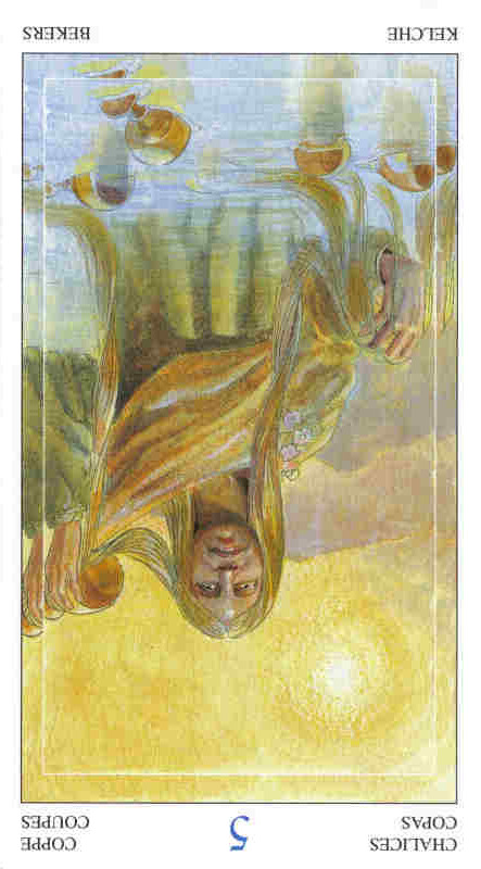 The 5 of Cups is about overcoming sadness and disappointment. You've let go of your old securities to embrace the new and exciting, now something has gone awry and you feel bad about that. But don't forget to notice those things that did go right.