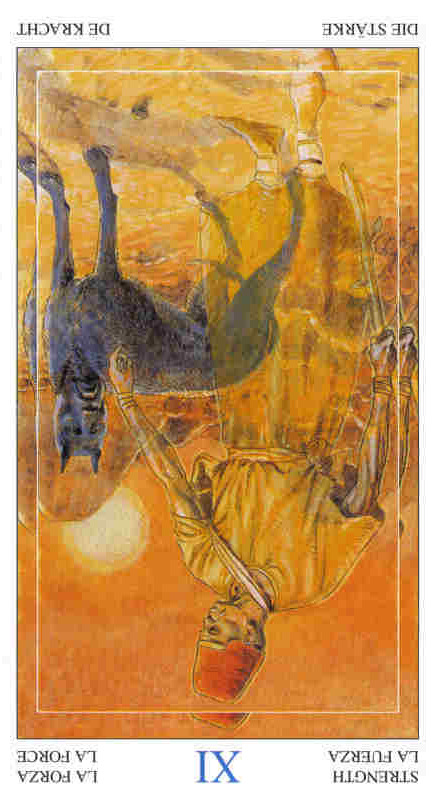 This card carries the number 11. In the Rider-Waite deck, Strength and Justice have swapped places because Waite saw links with the astrological signs Leo and Libra.