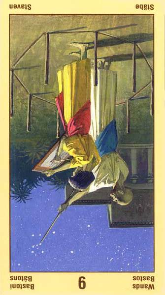 The 9 represents rest after work, which is another thing (like 8) that the element Fire associated with Wands is not very comfortable with. Fire likes to keep going. This rest will probably be spent thinking about what to do next along the course to completion.