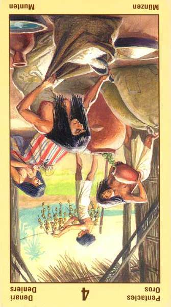 The 4 of Pentacles is about holding on to what you got. The number 4 represents structure and order, and fits well with the suit's element, Earth.