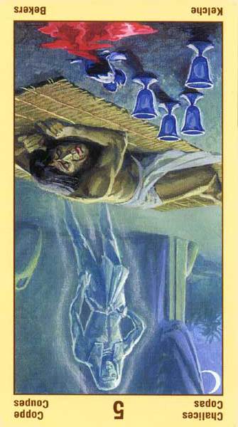 The 5 of Cups is about overcoming sadness and disappointment. You've let go of your old securities to embrace the new and exciting, now something has gone awry and you feel bad about that. But don't forget to notice those things that did go right.