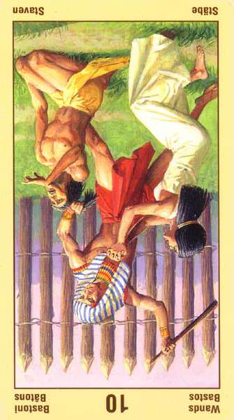 The 10 of Wands is therefore the transition from the element Fire (associated with Wands) to the element Water, associated with Cups. As you might imagine, this not the easiest of transitions.
