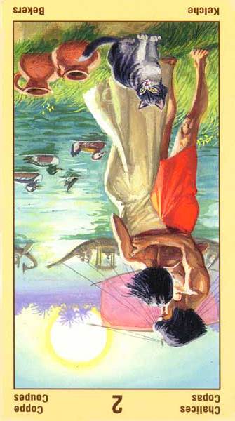 This the first assignment number of the Cups suit. Unlike Wands, with the Fire element, Cups, with the water element, has a lot more patience. Water is by nature more introspective, and this second card in the Cups suit is indeed about exploring yourself. The outcome is uncertain as always, but it usually results in better acceptance of yourself.
