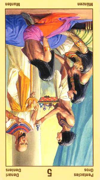 The 5 of Pentacles is an assignment-number card, and is about letting go of your securities. Pentacles element Earth (also) represents material posessions, so this card is about letting go of (some of) your worldly assets.