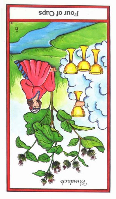 With the 4, the second cycle of this suit is commenced, where a choice between structure and feeling has to be made, where old securities have to be let go of to work towards a new future. But like Wands, Cups don't like structure much, they prefer to be free and dream rather than to make commitments and go for something.