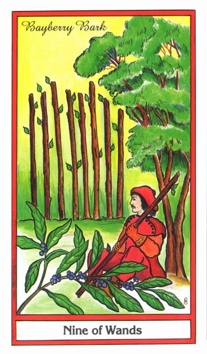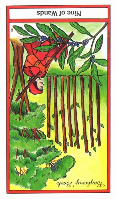 The 9 represents rest after work, which is another thing (like 8) that the element Fire associated with Wands is not very comfortable with. Fire likes to keep going. This rest will probably be spent thinking about what to do next along the course to completion.