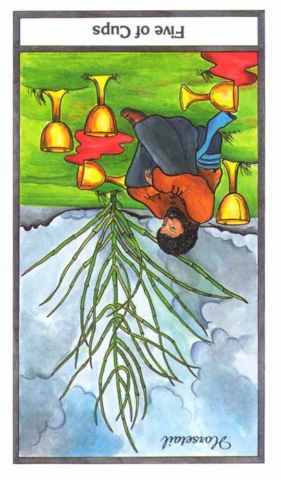The 5 of Cups is about overcoming sadness and disappointment. You've let go of your old securities to embrace the new and exciting, now something has gone awry and you feel bad about that. But don't forget to notice those things that did go right.