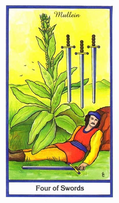 4 is the first number in the cycle of giving things shape. It's about making things real. The element of Swords also relates to making things real, so this enhances the effect so much that arrogance can cause you to exhaust yourself.