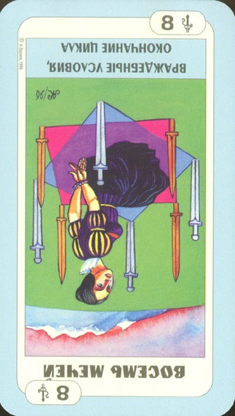 The 8 of Swords is about slowly regaining strength and energy. The 8 is an assignment number, and in the element of Swords it's a bit harder than usual.