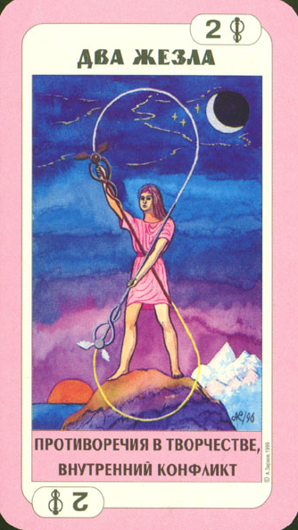The 9 represents rest after work, which is another thing (like 8) that the element Fire associated with Wands is not very comfortable with. Fire likes to keep going. This rest will probably be spent thinking about what to do next along the course to completion.