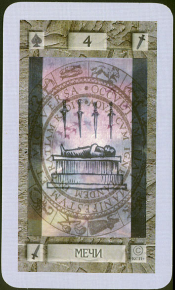 4 is the first number in the cycle of giving things shape. It's about making things real. The element of Swords also relates to making things real, so this enhances the effect so much that arrogance can cause you to exhaust yourself.