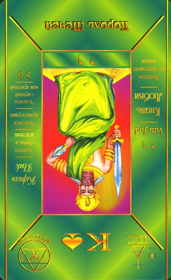 The King of Swords rules with diplomacy and a strong sense of responsibility, not just for himself but also for those around him, yet he is not afraid to make heavy decisions that compel him to eliminate dangers and dangerous opponents with some force.