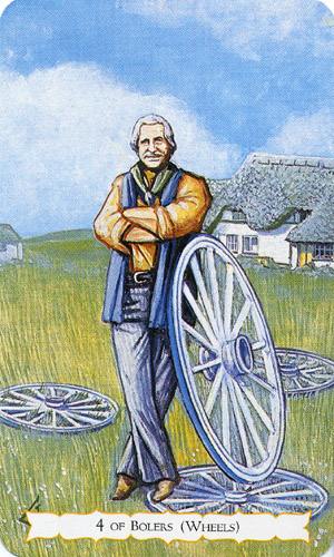 The 4 of Pentacles is about holding on to what you got. The number 4 represents structure and order, and fits well with the suit's element, Earth.