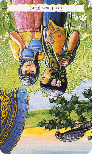 This the first assignment number of the Cups suit. Unlike Wands, with the Fire element, Cups, with the water element, has a lot more patience. Water is by nature more introspective, and this second card in the Cups suit is indeed about exploring yourself. The outcome is uncertain as always, but it usually results in better acceptance of yourself.