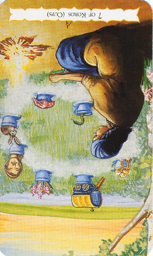 The 7 of Cups is about making a choice between different ideals. But Cups, with the water element, don't like making definitive choices that much, making this 7 in this suit a bit of a hard choice.