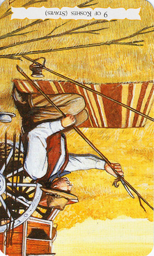 The 9 represents rest after work, which is another thing (like 8) that the element Fire associated with Wands is not very comfortable with. Fire likes to keep going. This rest will probably be spent thinking about what to do next along the course to completion.