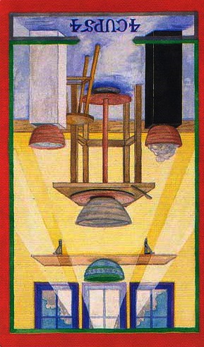 With the 4, the second cycle of this suit is commenced, where a choice between structure and feeling has to be made, where old securities have to be let go of to work towards a new future. But like Wands, Cups don't like structure much, they prefer to be free and dream rather than to make commitments and go for something.
