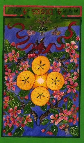 The 4 of Pentacles is about holding on to what you got. The number 4 represents structure and order, and fits well with the suit's element, Earth.