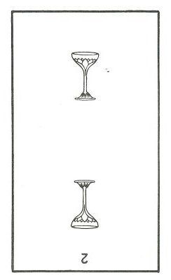 This the first assignment number of the Cups suit. Unlike Wands, with the Fire element, Cups, with the water element, has a lot more patience. Water is by nature more introspective, and this second card in the Cups suit is indeed about exploring yourself. The outcome is uncertain as always, but it usually results in better acceptance of yourself.