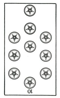 The 10 of Pentacles represents material posessions. The number 10 of Pentacles forms the links to the Ace (first card) of Wands (the first suit in the minor Arcana), and thus prepares to bring you back to the beginning of the minor Arcana, ready for a next cycle through the tarot.