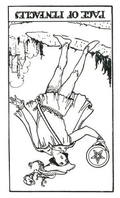 Pages explore and gather information about the road ahead, with an almost naive attitude. The Page of Pentacles is sometimes described as a bridge builder; Pentacles is the suit where the actual work is done, and the Page here enables those that follow to quickly cross difficult terrain.