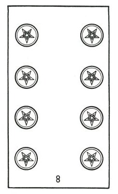 The 8 of Pentacles is about keeping up the hard work you're doing, and trying to be happy about doing that work at the same time. While the 3 of Pentacles is about completing a masterpiece, the 8 of Pentacles is about doing the apprentice work that makes you a master of your trade.