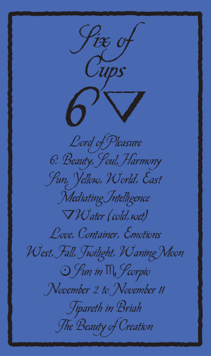 The 6 of Cups is about having confidence in something. It is the number of security and harmony. In the suit of Cups this means to be in harmony with yourself.