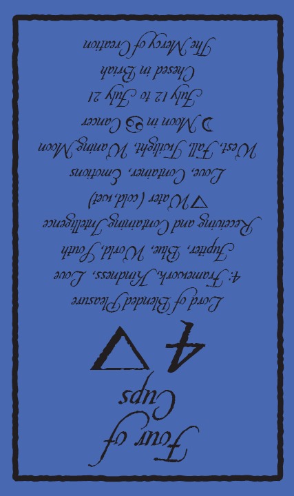 With the 4, the second cycle of this suit is commenced, where a choice between structure and feeling has to be made, where old securities have to be let go of to work towards a new future. But like Wands, Cups don't like structure much, they prefer to be free and dream rather than to make commitments and go for something.