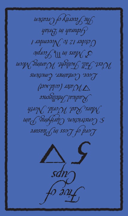 The 5 of Cups is about overcoming sadness and disappointment. You've let go of your old securities to embrace the new and exciting, now something has gone awry and you feel bad about that. But don't forget to notice those things that did go right.