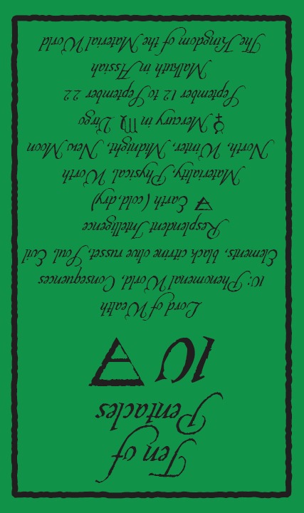 The 10 of Pentacles represents material posessions. The number 10 of Pentacles forms the links to the Ace (first card) of Wands (the first suit in the minor Arcana), and thus prepares to bring you back to the beginning of the minor Arcana, ready for a next cycle through the tarot.