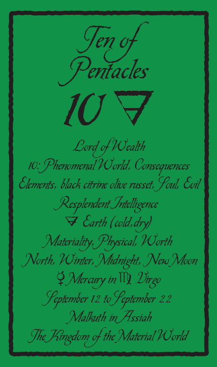 The 10 of Pentacles represents material posessions. The number 10 of Pentacles forms the links to the Ace (first card) of Wands (the first suit in the minor Arcana), and thus prepares to bring you back to the beginning of the minor Arcana, ready for a next cycle through the tarot.