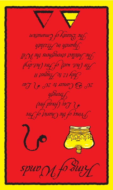 The King of Wands uses the properties of Wands (vitality, optimism, enthousiasm) to go out with confidence. He is seen as a leader with charisma.
