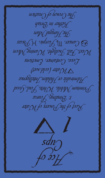 The number 1, associated with this Ace card, is the number of a fresh start with yet more new impulses coming your way. It might be compared to The Fool, the first card of the major arcana.