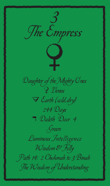 The Empress carries the number 3. This is the number of birth, of plenty, of harvest, of summer, of the first results. The number 3 stands for joy and fun, for creativity and fantasy, for warmth and humor.
