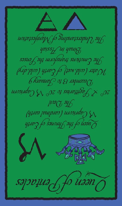 The Queen in the suit of Pentacles becomes aware of her Earthly attributes; she's reliable and sober, able to give good advice.