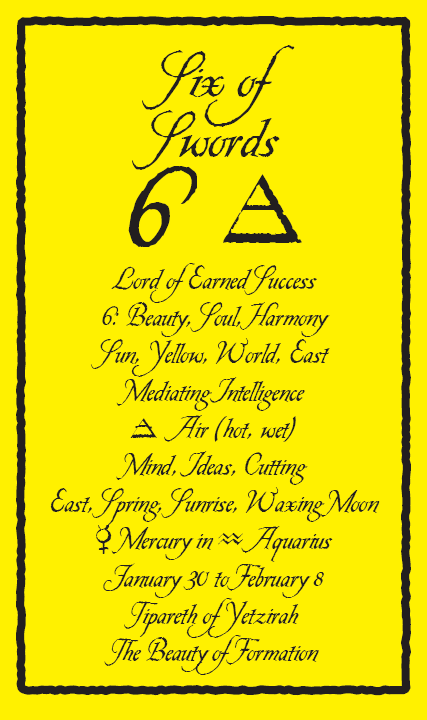 The 6 of Swords is a reward number after the hard assignment in 5 of Swords, it brings you to a safe place to rest a bit.