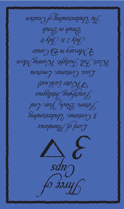 The 3 of Cups represents hope, faith and love. The 3 is a reward number and in this suit of Cups your feelings during that number will be that of joy and self-contentment.