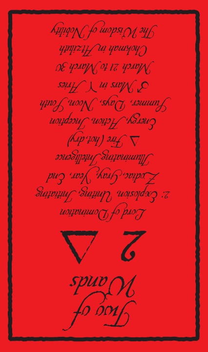 The 2 of Wands represents the research and digestion of a new idea. The number of this card and it's element are somewhat in conflict; while the 2 is focussed inwards, the Wand's element fire is outgoing. Fire wants to steam ahead while the blackbox 2 asks for patience.
