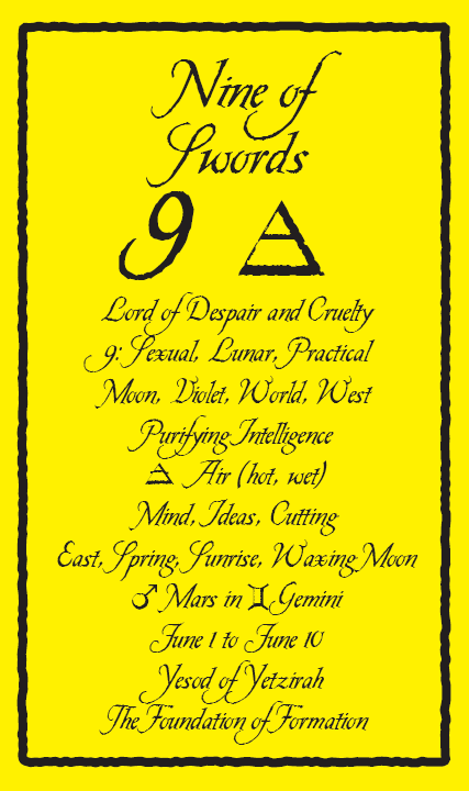 The 9 of Swords represents relief from cropped-up grief. The number 9 is a number of reward and rest and accomplishment. In the element of Swords there is not a lot of time for rest, but without any rest you'd just burn yourself out.