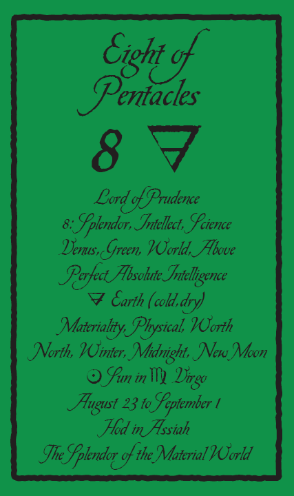 The 8 of Pentacles is about keeping up the hard work you're doing, and trying to be happy about doing that work at the same time. While the 3 of Pentacles is about completing a masterpiece, the 8 of Pentacles is about doing the apprentice work that makes you a master of your trade.